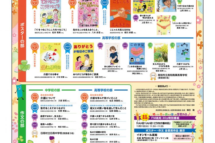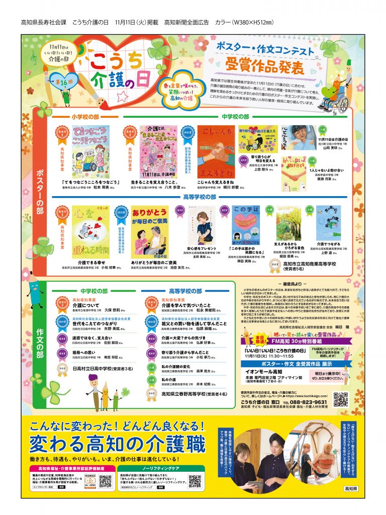 2025年11月11日(火)の高知新聞にて「こうち介護の日」のポスター・作文コンテストの受賞作品が一面で掲載されています。高知県の「介護の魅力発信」推進としての全面広告です。「認証評価制度」のポスターは電車やバスでも掲載されております。介護の魅力を感じていただけると幸いです。