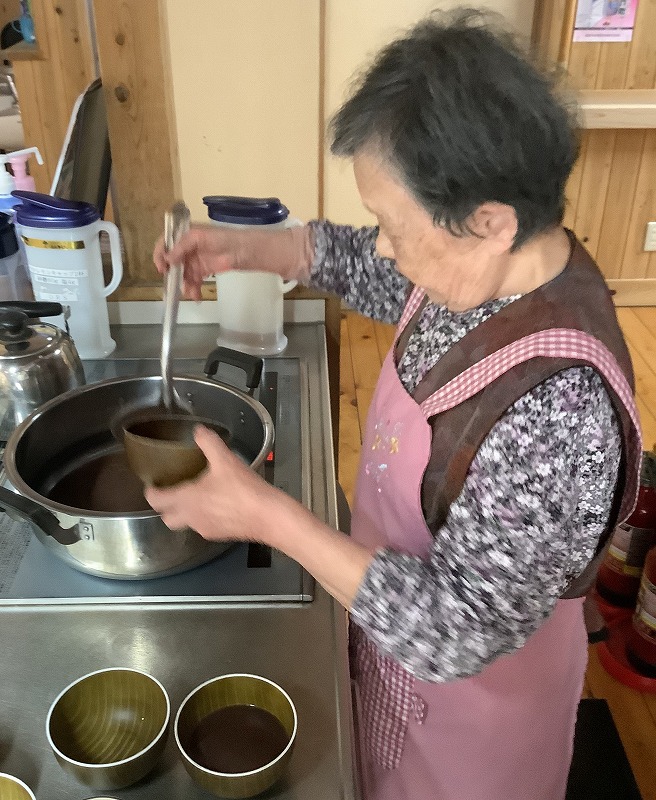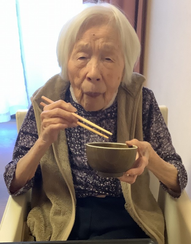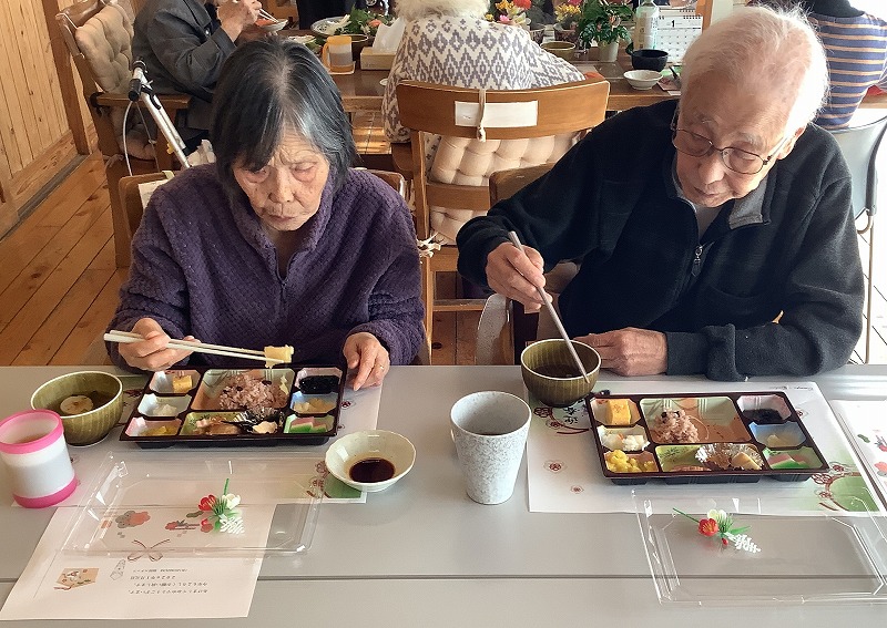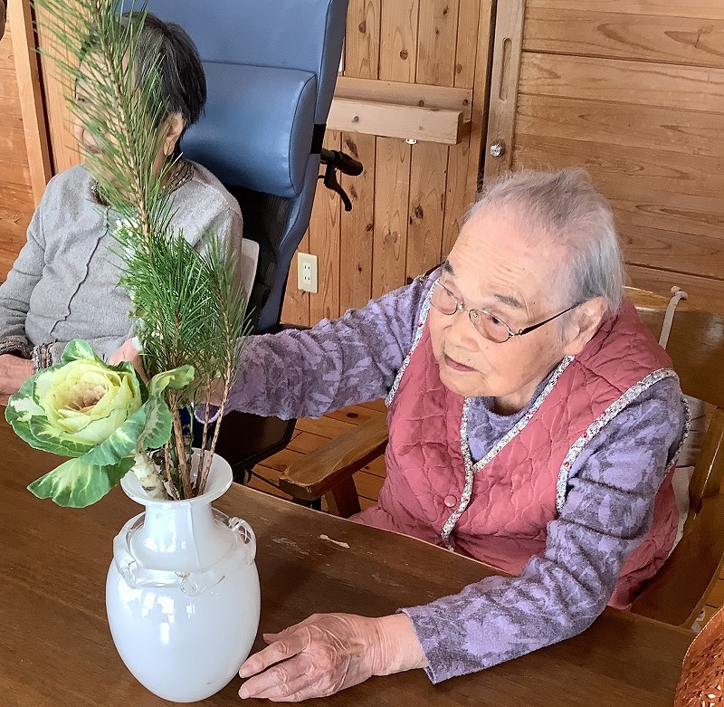 鏡割りレクとしてぜんざいを作りました。「あったかいね。」「美味しいね」と喜ばれました。また、門松飾りの花を使って生け花レクを。皆さんバランスよく活けられ綺麗な生け花が出来上がりました。